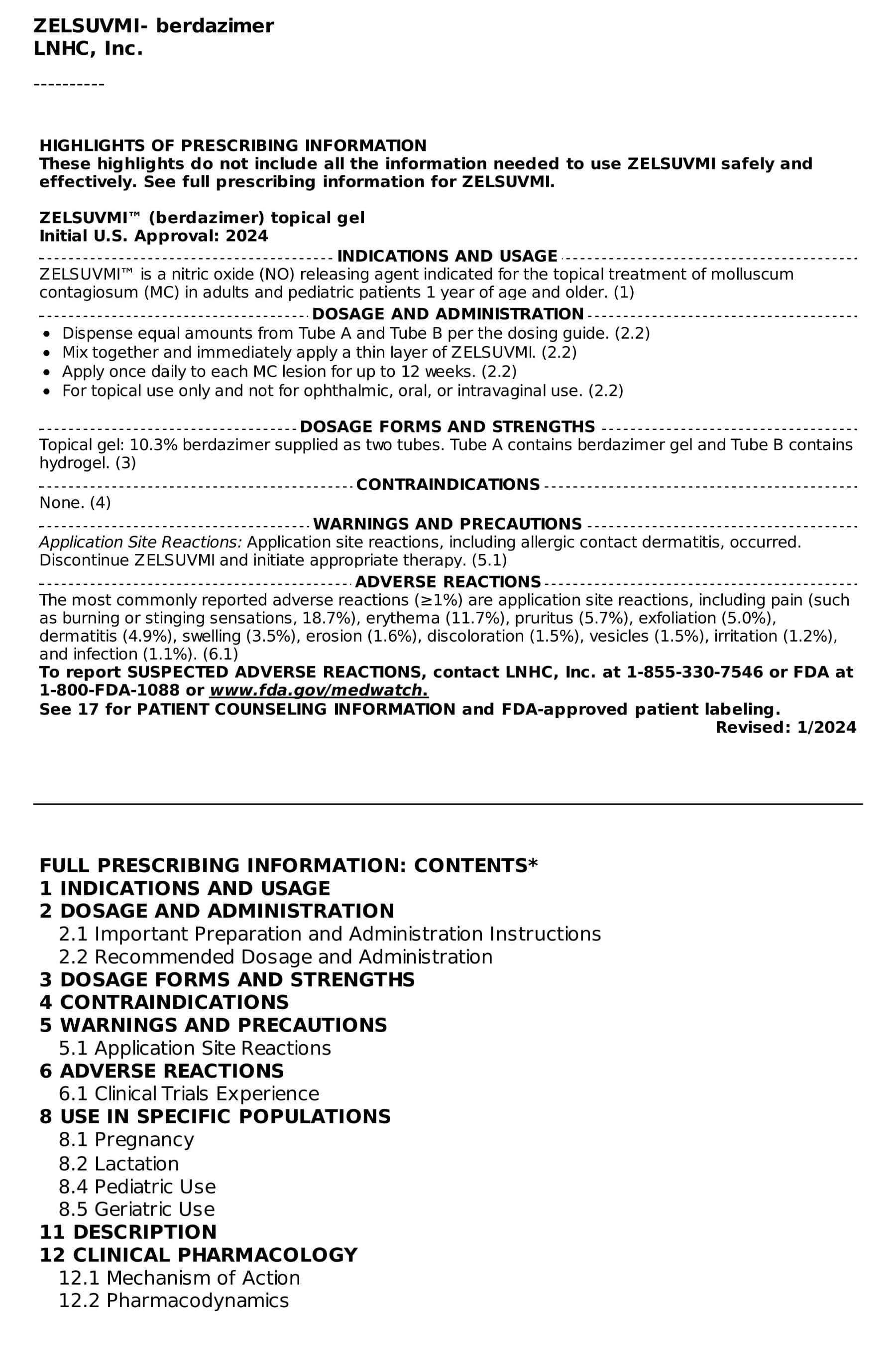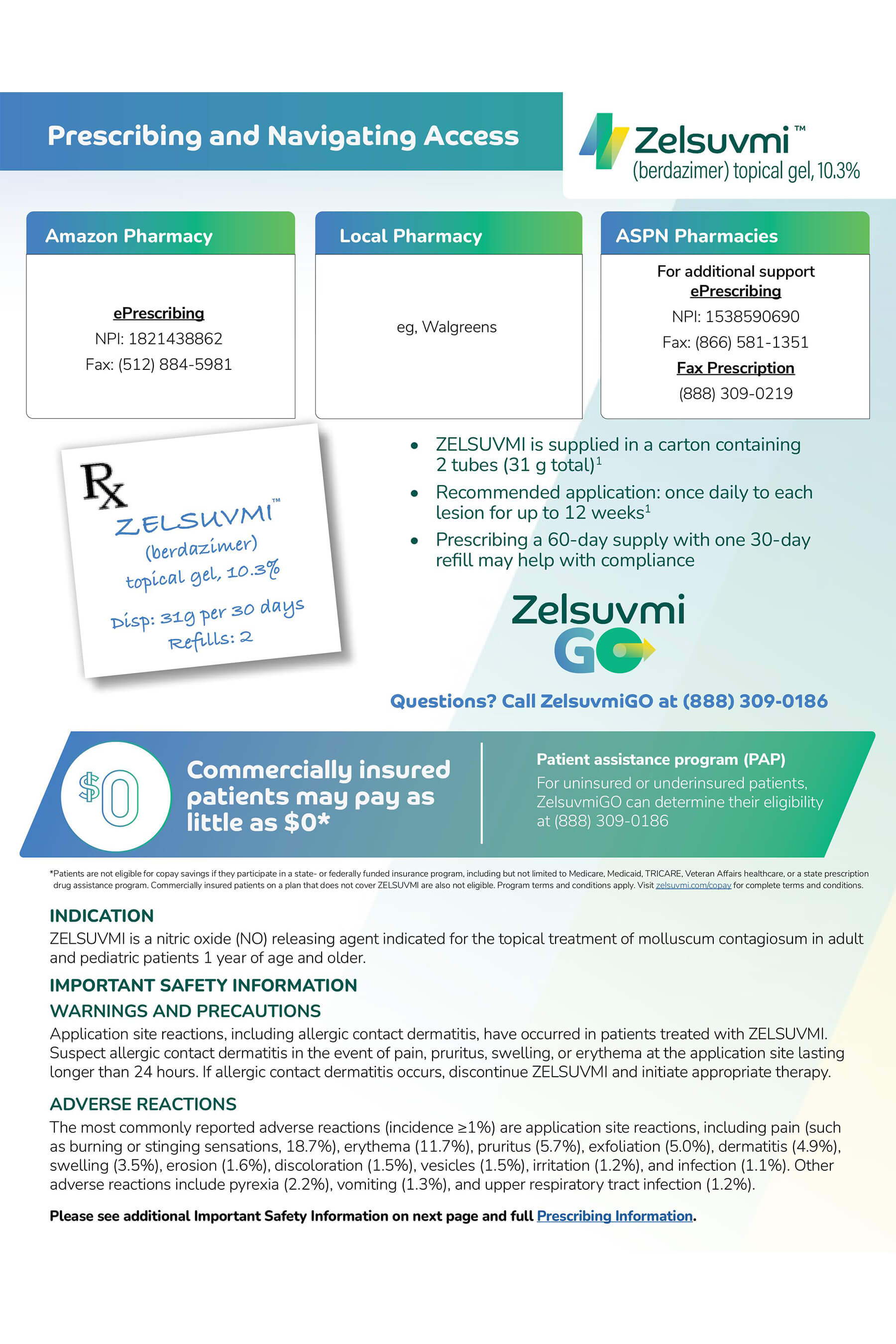 ZELSUVMI is a nitric oxide (NO) releasing agent indicated for the topical treatment of molluscum contagiosum in adult and pediatric patients 1 year of age and older.